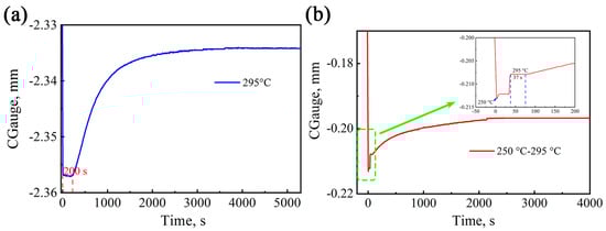 Expansion curve of phase transformation kinetics: (a) 295 °C; (b) 250–295 °C.