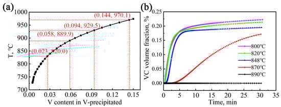 (a) V content in the austenite phase with the increase in the austenitization temperature; (b) Relationship between the volume fraction of VC and time.