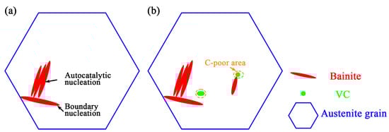 Mechanism diagram of VC particles to accelerate bainite transformation: (a) Initial transformation; (b).Precipitated particles accelerated transformation.