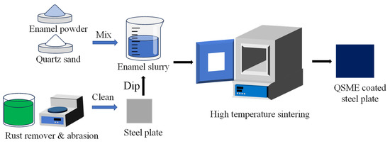 Carbon steel plates with dimensions of 40 mm × 40 mm × 1.8 mm were used in this study. Table 1 shows the chemical composition of the steel plate. The carbon steel plate is coated with quartz sand-modified enamel coating. All steel plates were cleaned with rust remover, abraded with SiC papers (#180–#1000 grits), and then washed with alcohol and deionized water before coating.