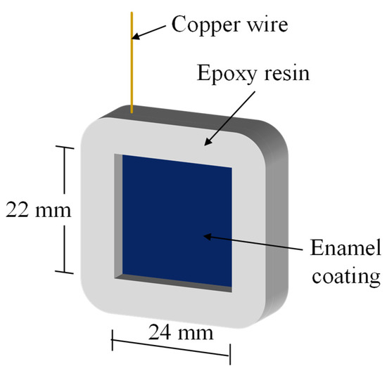 During the enamel coating process, only the front surface of steel plates was coated. Therefore, the other exposed surfaces should be covered for corrosion tests as depicted in Figure 3. One corner of the steel plate was soldered with a copper wire, and the back surface and four side surfaces were covered with epoxy resin to leave the middle coating area 22 mm × 24 mm immersed in the solution. The exposed area is approximately 5.28 cm2 as shown in Figure 3.