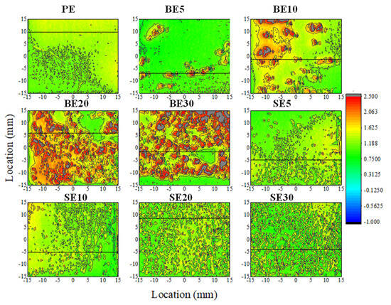 The surface profiles of PE- and QSME-coated steel plates are shown in Figure 6. It can be seen that the PE coating has a relatively smooth surface, and quartz sand can be clearly seen on the QSME-coated steel plates, especially for 0.83–1.70 mm quartz sand (red spots on specimens BE5, BE10, BE20, and BE30). For plates with the same size of quartz sand, the surface roughness increases with an increase in the quartz sand content.