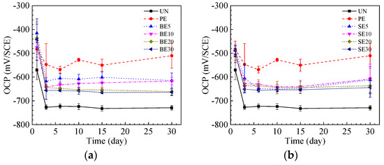 Open circuit potential evolution of QSME-coated steel plates with quartz sand size: (a) 0.83~1.70 mm, and (b) 0.38~0.83 mm.