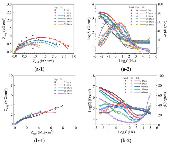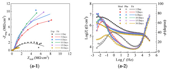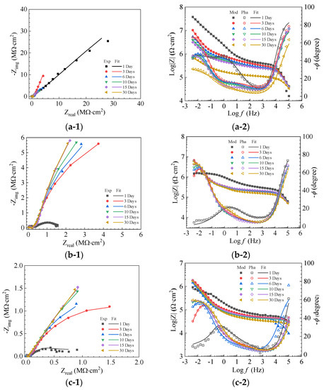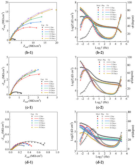 Figure 11 displays the EIS of 0.38~0.83 mm quartz sand-modified enamel (QSME)-coated plates. The impedance magnitude in the low-frequency range is in the same order as both PE (see Figure 8b) and 0.83~1.70 mm quartz sand-modified enamel (QSME)-coated steel plates (see Figure 10). For the Nyquist plot of QSME-coated steel plates with 5.0 wt.% as shown in Figure 11(a-1), the radius of the semi-circle increases from day 1 to day 15, while a significant decrease is observed on day 30. The increase in the first 15 days is mainly attributed to the block-up of corrosion products at the defective sites, while the decrease on day 30 is probably attributed to the falling of corrosion products from the defects as the steel plates are placed vertically during the whole test period.