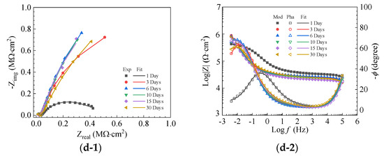 As the content of quartz sand increases to 10.0 wt.%, as displayed in Figure 10(b-1),(b-2), a dramatic increase in the impedance is observed after 3 days of immersion in 3.5 wt.% NaCl solution, followed by a gradual increase in the impedance over time. This is because there are some potential coating defects in the QSME-coated steel plate. On day 1, the solution penetrates the defected sites and leads to pitting corrosion at these sites. With an increase in time, the coating defect sites are gradually filled with corrosion products that slow down the penetration of oxygen and chloride and, therefore, result in a gradual increase in the impedance over time.