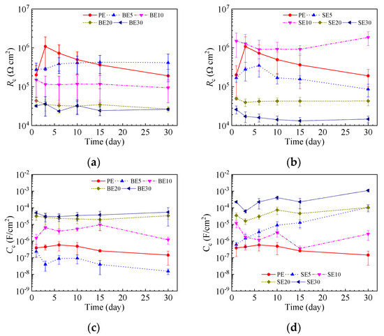 Coating resistance and coating capacitance of coated samples for (a) coating resistance of BE, (b) coating resistance of SE, (c) coating capacitance of BE, (d) coating capacitance of SE.