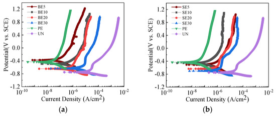 Figure 14 shows the potentiodynamic polarization curves of uncoated, PE- and QSME-coated steel plates in 3.5 wt.% NaCl solution. The parameters extracted, including the corrosion potential and corrosion current density, are listed in Table 4. The average corrosion potential and corrosion current density of uncoated steel plates are −730 mV/SCE and 33.0 µA/cm2, respectively. PE coating reduces the corrosion current density to 0.46 µA/cm2. The average corrosion current densities are 0.22 µA/cm2, 0.58 µA/cm2, 0.30 µA/cm2, 0.79 µA/cm2 for specimens BE5, BE10, BE20, and BE30, respectively. Therefore, QSME coating improves the corrosion resistance of steel plates. The effect of the quartz sand content on the corrosion resistance of the QSME-coated steel plate is not obvious. For 0.38~0.83 mm QSME-coated steel plates, the corrosion current densities are 0.38 µA/cm2, 0.13 µA/cm2, 0.12 µA/cm2, 0.44 µA/cm2 for specimens SE5, SE10, SE20, and SE30, respectively.