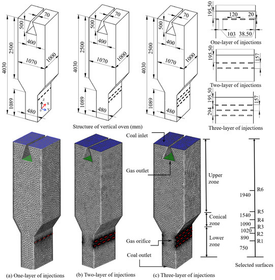 Based on this reasoning, a physical model with only one combustion chamber was constructed in this work to better understand the flow characteristics of the vertical oven based on long-term experience in engineering research. Figure 2 shows the physical model of the minimum unit of the vertical oven according to the industrial installation, ignoring the coke-quenching section. A model with a height of 4030 mm could be divided into three zones (upper zone, conical zone and lower zone) along the bed height. First, the upper zone had a height of 2500 mm and a rectangular section with a width of 1070 mm. A triangle-shaped gas-gathering device with a width of 400 mm was installed on the top of the upper zone. Second, the conical zone was neck area, which was a reduction trapezoid with a height of 441 mm and an incidence angle of 56.22°. The lower zone below the conical zone had a height of 1089 mm. The lower zone had two or three layers of rectangular orifices, as shown in Figure 2. The rectangular orifice had a height of 20 mm and a width of 120 mm. The detailed distribution of the orifices is shown in Figure 2. During the operation, the coal exited from the top of the moving bed and then flowed out the bed from the bottom, as shown by the blue arrow. Part of the gas was recycled into the oven to produce the gas heat carrier. The gas flowed into the moving bed through the orifices and then flowed out from the moving bed through the top triangle-shaped gas-gathering device. The coal–gas flow was a counter current in the reactor. The bed height, gas orifices, and position of the gas-gathering device affected the gas distribution. A uniform gas distribution in the upper zone is difficult to achieve due to the complex coal–gas interactions. Figure 2 shows the unstructured grid of the physical model. The number of grid elements was determined to be 515,000 after a grid independence test. Cross sections L1–L5, at heights of 1.56952, 1.97729, 2.38504, 2.79279, and 3.20054 m, respectively, were selected to compute the standard deviation and mixing entropy.