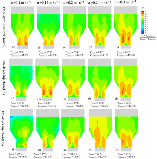 - The number of gas injection layers had a significant effect on the gas velocity distribution in the lower zone but a small impact on the upper zone. In the upper zone, the velocity profile closely resembled the contour of an open–upward parabola with a large range. Compared with one or three injection layers, the distribution of coal particles was more uniform when two injection layers were used.