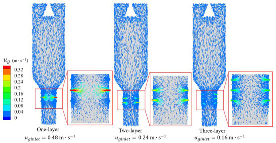 Figure 5 illustrates the impact of the injection layer on the distribution of the gas flow vectors. Three cases were simulated with the same gas volumetric feeding rate. Each injection layer had the same cross-sectional area. The gas feeding rate with a single injection layer was 0.48 , while that with two injection layers was 0.24 , and that with three injection layers was 0.16 . All three cases predicted the injection flow in the lower zone and a uniform gas distribution in the upper zone. In the lower zone, the gas injection length decreased with the increase in the number of orifice layers due to reduced inlet gas velocity. The single-layer case produced the strongest penetration and reflux, whereas the three-layer case had small reflux. These three divergent gas flow characteristics significantly affected the combustion process. The single injection layer was more likely to achieve robust combustion and increase the likelihood of over-burning. Conversely, an increased number of injection layers could produce moderate combustion or a significantly longer injection and a lower gas flow rate injected into the lower zone, thereby increasing the likelihood of under-burning. The design with multiple injection layers allowed flexible control of the air and gas injection possibilities. Li et al. [25] found that secondary gas injection tended to reduce gas back-mixing in a fluidized bed. With better gas–solid mixing, the secondary gas was injected through the distributed jet arrangement. The multiple injection layers in the present work played a similar role to the secondary gas injection. A symmetric arrangement of the injection system is the preferred design.
