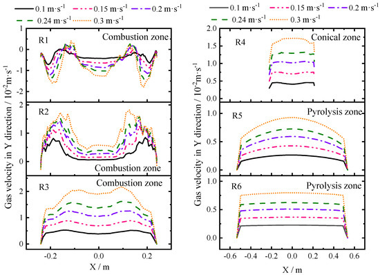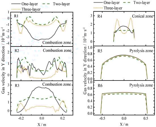Figure 6 illustrates the effect of the injection layers on the gas velocity in the Y direction, indicating the flow direction and reflux degree. The injection layers had a significant effect on the gas velocity in the Y direction in the lower zone (R1–R3) and conical zone, whereas the orifice layers hardly had any effect on the gas velocity in the upper zone, such as along the lines of R5–R6. In section R1, the velocity profile of a single injection layer closely resembled the contour of an open–upward parabola with a large range. Xiaoyan [26] also found an open–upward parabola of the velocity profile in the upper zone based on a porous media model for a vertical oven with single injection layer. Wu et al. [27] numerically investigated the flow and heat transfer process during coal pyrolysis in a vertical oven (height of 8400 mm and inlet diameter of 100 mm) with two injection layers. Uniform streamline profiles was simulated inside the inner bed, which was similar to the present results. The maximum velocity in the Y direction was −0.035 , while two and three injection layers produced a much narrower range. In section R2, the velocity profile showed multiple peaks. The cases with one and two injection layers had velocities in the positive direction, while the case with three injection layers had velocities in the negative direction. In section R3, the velocity profile for a single injection layer was a mirror image distribution of R1. All three cases showed a positive velocity distribution, indicating upward flow.