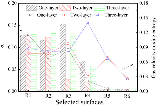 Figure 7 shows how the coal particles were distributed in different areas of the lower and upper zones. The standard deviation of the coal phase volume fraction of the upper zone was higher then that in the lower zone. This means that the distribution of coal particles was more uniform in the upper zone. When two injection layers were used, the distribution of coal particles was more uniform than with one or three injection layers in sections R1, R3, R4, R5, and R6. The average mixing entropy of the gas phase velocity also played an important role. In areas such as R2, R4, R5, and R6, the single-injection-layer case had a lower mixing entropy than two-layer and three-layer cases. This means that the flow process was more efficient when using multiple injection layers, as it reduced the reflux. This information could be useful for applying multiple injection layers in the design of vertical ovens.