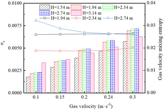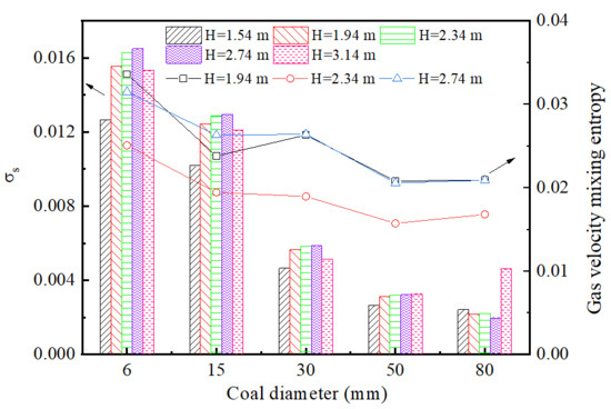 Figure 8 shows the variation of the solid fraction standard deviation with the bed height in the upper zone. The standard deviation generally decreased in the range of 6–80 mm. This suggested that the increased coal particle diameter resulted in a much lower deviation and a more uniform gas distribution. However, a coal diameter between 6 and 15 mm led to a higher standard deviation of the solid fraction, indicating an uneven gas fraction distribution. Figure 8 illustrates the effect of increasing diameter on the gas velocity mixing entropy. The mixing entropy initially decreased with increasing coal diameter. Furthermore, an increase in the bed height reduced the gas velocity mixing entropy. It is evident that coal diameter had a significant effect on the standard deviation and mixing entropy of the gas velocity.