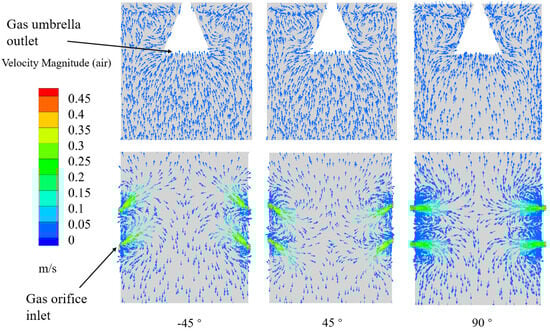 Effect of gas feeding angle on gas distribution near gas orifice inlet and umbrella outlet with t = 20 s, = 30 mm, = 0.24 , and = 4.2 .
