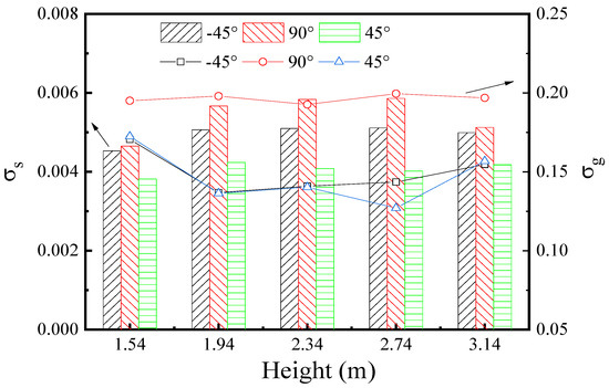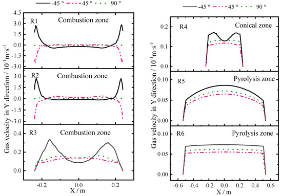 Figure 11 shows the effect of the gas feeding angles of −45°, 90°, and 45° on the gas distribution. The gas feeding angle changed the direction of the flow jet in the lower zone. As the feeding angle decreased from 45° and 90° to −45°, the gas velocity in the Y direction increased to some extent. However, the velocity profile showed high agreement in the upper zone for feeding angles of 45°, 90°, and −45°, as shown in Figure 12. The feeding angle of 45° yielded the minimum coal solid fraction standard deviation and the lowest gas velocity mixing entropy, as shown in Figure 13, which corresponded to a more uniform gas velocity distribution and much less reflux. Wei et al. [32] found that a double-symmetric feeding pipe with a feeding mouth angle of 45° produced a more uniform solid distribution in a fluidized bed. The feeding angle of 45° could prolong the gas residence time to reduce the probability of gas bypassing. This suggested that a feeding angle of 45° should be selected in designing a vertical oven.