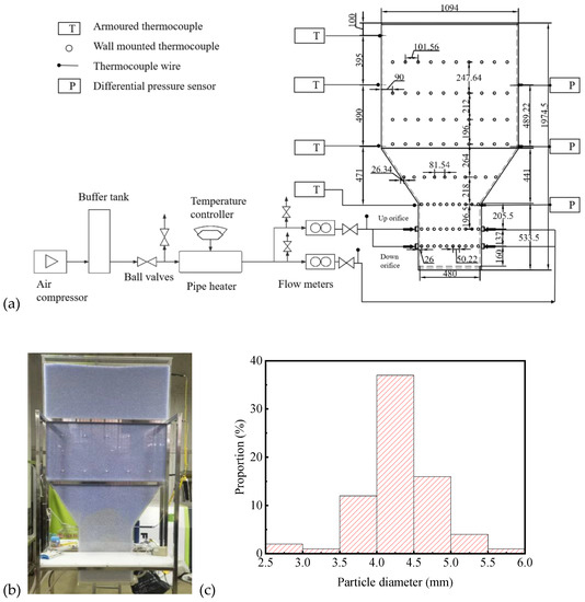 The three-dimensional vertical-oven experimental setup with a multi-injection structure was built. The experimental setup included a hot-gas supply system and an experimental section. A screw compressor (22 kW) was applied to provide air flow. A buffer tank was installed to maintain a stable pressure and reduce pressure fluctuations. The air flow was heated by a pipe heater (6 kW) with a temperature controller. In the experiments, air was compressed and heated by an auto-controlled pipe heater. Its temperature was recorded by an inserted thermocouple wire, and the flux was measured by a vortex flowmeter. The flow rate was regulated by ball valves. The hot air flow was injected into the vertical oven through the orifices. Two layers of orifices were tested in the experiment. The height of the experimental section was 2000 mm, the width of the bottom combustion section was 480 mm, and the height of the main pyrolysis section was 1094 mm (Figure 14a,b). The thickness of the experimental section was 100 mm. Four temperature sensors and three pressure-difference sensors were installed in the experimental section to obtain the bed temperate and pressure drop. In the front wall of the section, 80 points were labeled to record the wall temperature using wall attachment thermocouples. The detailed positions of the temperature measurement points are shown in detail in Figure 14a. The wall temperature of the vertical oven was mainly dependent on the hot-gas flow velocity in the local area. Heat gas can be viewed as a tracer to quantify flow [33]. The measurements of the wall temperature indicated the local gas velocity. Three pressure differential sensors were applied to measured the bed pressure drop. The location of the measurement points are shown in Figure 14. The bed material was polyvinylchloride particles with a real density of 1340 and a narrow diameter range of 3.5–5 mm (Figure 14c).