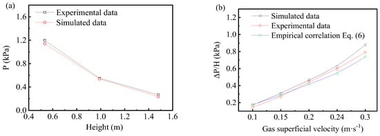 Figure 15a shows that the pressure drop decreased with an increase in the bed height. The simulation results were very close to the measured pressure drops, with an averaged deviation of 6.1%. Figure 15b shows that the pressure drop increased with the gas velocity. The simulation results agreed well with the correlation and experimental data, with a deviation below 10%. Zhang et al. [35] experimentally investigated the pressure drop of a moving bed (the maximum material bed height was 700 mm) fed with Yulin coal with a diameter of 30 mm. They found the deviation of the pressure drop calculated by the Ergun equation and the actual industrial operation data was about 10%. The Ergun equation is suitable for predicting the pressure drop of a vertical oven.