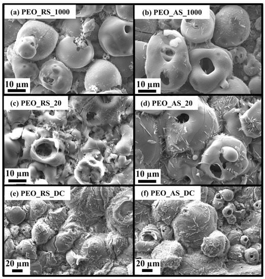 In the case of PEO_RS_1000 and PEO_AS_1000, such formations have a globular shape more pronounced than the other cases, with an average dimension of 32 6.4 and 37 6.7 µm, respectively. The globules are often crossed by pores as a result of the pressure exerted by the gas generated during the treatment. Observing samples prepared at 20 Hz, the protuberances appear flatter particularly if considering PEO_RS_20. This can be related to the kinetics of the process, strongly dependent on the anodization frequency. If low frequencies are used, in fact, gas evolution produced according to parasitic reactions has more time to evacuate the sample, resulting in a flatter surface. Moreover, several small cracks cross the surface of samples prepared with rutile particles at 20 Hz as a result of the release of thermal stresses. Finally, in the case of coatings produced in the DC regime, apart from globules, it is possible to notice large nodular structures requiring the use of a lower magnification. The porosity of PEO_RS_DC and PEO_AS_DC is reduced, and even the presence of cracks seems to be quite limited. Another feature common to all types of samples is the formation of acicular structures all over the surface. These architectures are particularly abundant on oxides produced working in the DC regime.