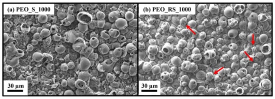 To better investigate the influence of the microparticle incorporation morphology of the PEO samples, a comparison between oxides produced at 1000 Hz with and without microparticles was performed. PEO_S_1000 samples (Table 1) were produced using the same electrical parameter described for PEO_XS_1000 samples and by carrying out the treatment in a 1 M NaOH solution containing 4 gL−1 Na2SiO3.