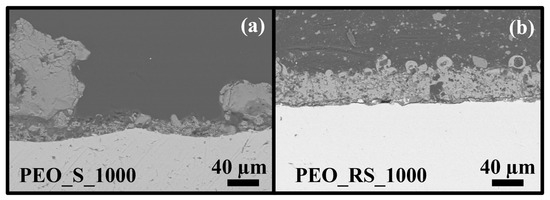 The oxide cross-sections of PEO_S_1000 and PEO_RS_1000 are compared in Figure 4. It is evident how working in the absence of microparticles, a highly inhomogeneous coating is produced, where thicker regions (>100 μm) are interrupted by areas where the oxide thickness is reduced to about 20 μm. This thickness decrease is probably due to the presence at the interface between PEO_S_1000 and the substrate of an oxide layer, which seems characterized by a lack of sintering responsible for the partial detachment of the oxide external layers. In contrast, the PEO process performed in a solution containing rutile microparticles leads to the formation of a much more uniform coating (Figure 4b).