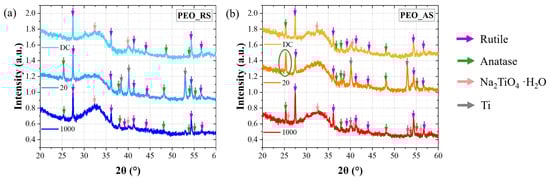 Examining anatase reflections, in fact, it is possible to notice they are almost absent in all of the coatings of the PEO_RS series (apart from small peaks mainly visible for oxides produced at 20 Hz), while they become more numerous and intense for oxides prepared using anatase microparticles. In PEO_AS_20, the anatase peak at 25.34° (circled in green, card number: 98-006-3711) becomes even more intense than the rutile peak at 27.46° (card number 00-001-1292), which, in all of the other samples, is the dominant polymorphic phase. Another peculiarity of oxides produced working at 20 Hz with both rutile and anatase is the presence of quite intense Ti signals. This may be related to the reduced thickness and defective nature of the coatings (observed from SEM images), which allow X-rays to penetrate into the substrate. The XRD also reveals the presence of peaks of sodium titanium oxide hydrate, which are present in all of the oxides except for those treated at 20 Hz. A characteristic common to all of the PEO samples is, instead, the presence in all of the diffractograms of a broad peak around 28 to 35° that is related to the formation of an amorphous material, probably associated with the presence of amorphous silicates and silica [15,16,17,18,19].