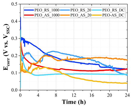 The PEO treatments increase the nobility of the titanium substrate. All of the anodized specimens, in fact, show a positive Ecorr ranging between 0.04 and 0.3 V vs. VSSC, while according to [13], shortly after the immersion of Ti Gr. 2 in the aggressive solution, its corrosion potential drops to about −0.48 V vs. VSSC and, after a few hours, stabilizes in the active region at about –0.65 V vs. VSSC (see also Supplementary Materials Figure S1), where abundant hydrogen evolution is detected. Concerning the PEO samples, a rapid decrease in Ecorr during the first 2–3 h of immersion is observed for all of the samples. After this first step, different trends could be distinguished. The corrosion potential of PEO_AS_1000 remains almost stable for the residual duration of the test as it occurs for PEO_RS_DC, with the difference that the latter shows a lower Ecorr, meaning that the anodic reaction is slightly more depolarized in this case. PEO_RS_1000 is characterized by a monotonically decreasing Ecorr even if it presents more noble values for the first 5 h of immersion. The corrosion potential of PEO_RS_20, PEO_AS_20, and PEO_AS_DC after the initial decrease rises to higher values. In the first two cases after the increase, a second drop in Ecorr takes place, while concerning PEO_AS_20, an average value of 0.183 V vs. VSSC is maintained for the remaining time of the immersion test. After about 16 h of immersion, all of the potentials become stable apart from that of PEO_RS_20, which continues to decrease.