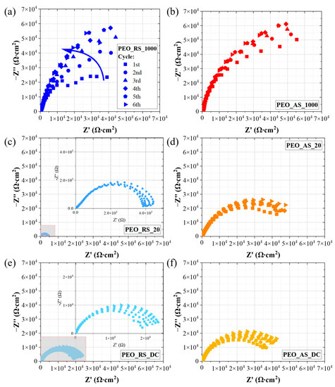 Nyquist diagrams of (a) PEO_RS_1000 (the arrow indicates the time evolution of the Nyquist curves), (b) PEO_AS_1000, (c) PEO_RS_20, (d) PEO_AS_20, (e) PEO_RS_DC, and (f) PEO_AS_DC in H2SO4 10 %v/v at 60 °C.