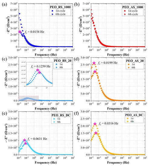 Imaginary impedance of (a) PEO_RS_1000, (b) PEO_AS_1000, (c) PEO-RS_20, (d) PEO_AS_20, (e) PEO_RS_DC, and (f) PEO_AS_DC (a different scale is used for PEO_XS_1000).