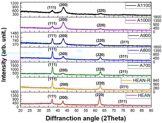 As represented in Figure 3 and listed in Table 3, the average thickness values of HEAN, HEAN-R, A700, A800, A900, A1000, and A1100 are 992, 721, 605, 521, 490, 471, and 439 nm, respectively. The average deposition rate of each coating is also calculated and given in Table 3. The extremely high deposition rate of the HEAN coating of 11.02 nm/min is approximately three times higher compared with the deposition rate of 3.61 nm/min for the HEAN-R coating deposited with 360° rotation of the substrates, likely related to the lack of substrate holder rotation during sputtering. As compared with the deposition rate of 3.61 nm/min for the HEAN-R coating, the slightly lower deposition rate of 3.03 nm/min for the A700 coating is caused by the lower MF power of the Al4Cr2NbSiTi2 target. In addition, the coating deposition rates gradually dropped from 2.62 to 2.20 nm/min as the MF power of the Al4Cr2NbSiTi2 target decreased from 700 to 200 W.