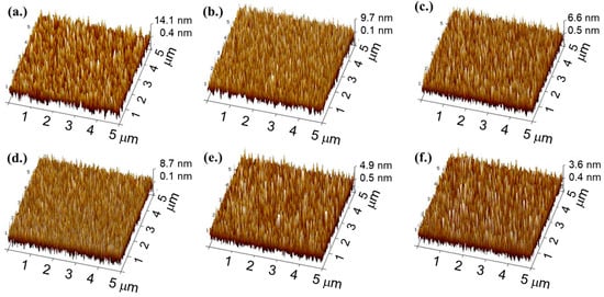 AFM surface topography images of (a) HEAN, (b) A700, (c) A800, (d) A900, (e) A1000, and (f) A1100 coatings.