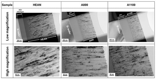 The cross-sectional TEM bright-field micrographs at low and high magnifications for HEAN, A800, and A1100 coatings.