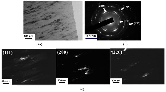 The cross-sectional TEM (a) bright-field micrograph, (b) selected area electron diffraction pattern, and (c) dark-field images of the (111), (200), and (220) planes for the A1100 coating.