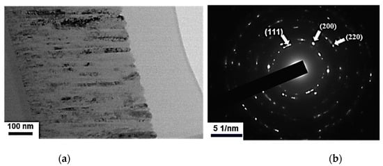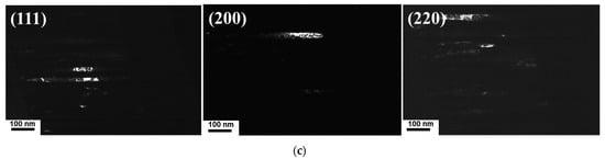 The cross-sectional TEM bright-field image of the HEAN coating is depicted in Figure 5a. A typical FCC structure is confirmed through the selected area electron diffraction (SAED) pattern in Figure 5b, which is also identified with the GIXRD in Figure 1. Three dark-field images of the (111), (200), and (200) planes are presented in Figure 5c. The HEAN coating had a large grain size distribution of approximately 34 nm. The cross-sectional TEM bright-field image, SAED pattern, and the corresponding dark-field images of the (111), (200), and (200) planes of the A800 and A1100 coatings are represented in Figure 6a–c and Figure 7a–c, respectively. A relatively dense and fine columnar grain feature was observed for the A800 coating, which was confirmed with GIXRD, and exhibited a narrower columnar grain width of approximately 19.8 nm. A finer and more compact columnar grain with a narrow width was obtained for the A1100 coating grown with the lowest MF power, and its average columnar grain width was 16.8 nm. These coatings show the typical columnar grain growth model based on the TEM images. According to the GIXRD and SAED results, although the addition of Al and Cr increased the ratio of (Al + Cr)/(Al + Cr + Nb + Si + Ti) from 59% to 91%, the crystal structure of all coatings remained in the FCC phase, and the grain refinement effect was also observed.