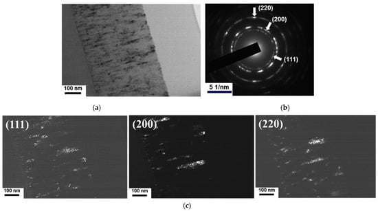 The cross-sectional TEM (a) bright-field micrograph, (b) selected area electron diffraction pattern, and (c) dark-field images of the (111), (200), and (220) planes for the A800 coating.
