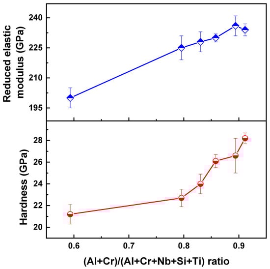 Relationship between hardness in color red, reduced elastic modulus in blue color, and (Al + Cr)/(Al + Cr + Nb + Si + Ti) ratio. The hardness and reduced elastic modulus of the HEAN-R coating are not compared.