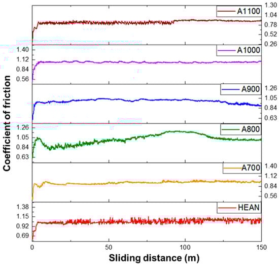 The coefficient of friction for six AlCrNbSiTiN coatings.
