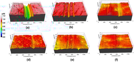 Three-dimensional wear track images for (a) HEAN, (b) A700, (c) A800, (d) A900, (e) A1000, and (f) A1100 coatings.