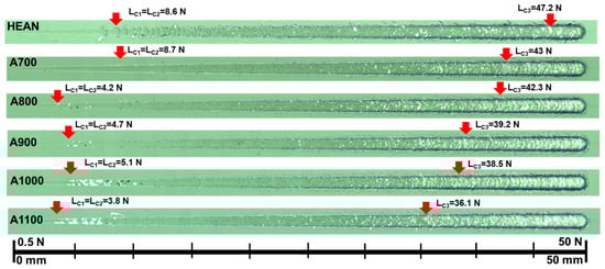 Scratch tracks of six AlCrNbSiTiN coatings and their critical loads.