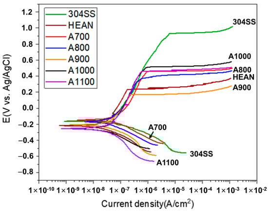 Figure 12 reveals the potentiodynamic polarization curves of the bare 304SS substrate and high-entropy alloy nitride coatings, except HEAN-R, tested in a 3.5 wt.% NaCl aqueous solution, and their corrosion characteristics, including corrosion potential (Ecorr), corrosion current density (icorr), polarization resistance (Rp), pitting potential, and passivation range, are listed in Table 4. It is noted that pseudo-passivation behaviors [36,37] are observed in all coatings and the 304SS substrate, as depicted in Figure 12. The current density values of the high-entropy alloy nitride coatings tended to be stable at approximately −0.1~0.5 V vs. Ag/AgCl. However, this is not the real passivation state because the current density increased from approximately 10−7 to 10−6 μA/cm2, implying the passivation film cannot effectively retard the corrosion attack of the substrate, which is named pseudo-passivation [36,37]. Similar pseudo-passivation behaviors were also reported in the high-entropy alloys [38,39] and high-entropy alloy coatings [40]. The pitting potential is the potential value where the protective passive film starts to pit and the current suddenly increases. The icorr values for all nitride coatings are smaller than that of 304SS, 0.036 μA/cm2, suggesting better corrosion resistance. Similarly, good corrosion protection effects produced by the high-entropy alloy nitride coating, such as (AlCrSiTiZr)100−xNx [23] and TiZrNbTaFeN [26], on stainless steel substrates were previously noted in the literature.