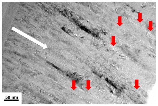 The polarization resistance (Rp) ratio between each thin film and the bare 304SS substrate was calculated. The AlCrNbSiTiN coatings can improve the corrosion resistance performance of the bare 304SS substrate because these high-entropy alloy nitride coatings, except for the A700 coating, had Rp ratios between 1.31 and 2.45. The slightly lower Rp ratio of the A700 coating may be due to its white line-like porosity defects among the columnar grain boundaries (marked by red arrows) adjacent to the columnar grain boundaries, as shown in Figure 13, which allowed for corrosive electrolytes to penetrate into the 304SS substrate. It is well known that the smaller chlorine ions in the sodium chloride aqueous solution can penetrate through the columnar grain boundaries, intrinsic pinholes, and surface defects of the coating and corrode the 304SS substrate [26]. The microstructure defects in the coating, such as the number of white line-like porosity defects among the columnar grains, not the width of columnar grains [26], in Figure 13, become very important roles to the corrosion resistance of the coating. As depicted in Figure 5a and Figure 7a, the cross-sectional TEM microstructures without any white line-like porosity defects can be observed for the HEAN and A1100 coatings, which exhibit higher Rp ratios of 2.45 and 2.28. On the other hand, some white line-like porosity defects are discovered in the cross-sectional TEM image of A800, as shown in Figure 6a, which has a lower Rp ratio of 1.31.