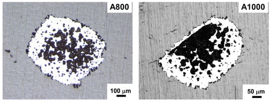 The surface optical microscope images of the A800 and A1000 coatings after the corrosion test. The black corrosion pits can be clearly observed, whereas the brighter regions are the corroded 304SS substrates due to the delamination of the coatings.