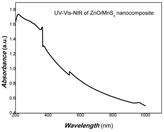 The UV-Vis-NIR of ZnO nanosheets/MnSx nanocomposite was examined. The results are shown in Figure 3.