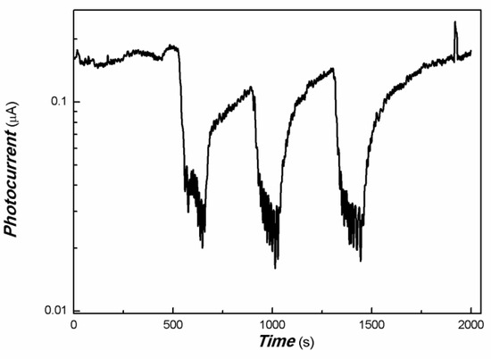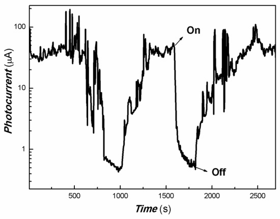 Figure 4 shows that the ratio of on/off of ZnO nanosheets/MnS to weak visible light was changed greatly, by about two orders of magnitude. Since a large number of defects in the interface between ZnO nanosheets and MnSx nanoparticles were presented, the electrons generated by light inducement were trapped by these defects. The holes were accumulated at these interfaces, which resulted in the decrease in the thick film current of the nanocomposite. It is expected that these holes generated by light inducement had a strong oxidation ability, which led to the degradation of some organic pollutants. This illustrated that the ZnO nanosheets/MnSx nanocomposite showed good activity to weak visible light, which can easily produce a photo-induced charge, avoiding the recombination of charges produced by visible light.