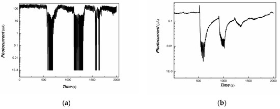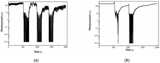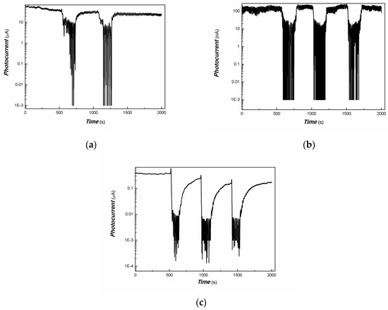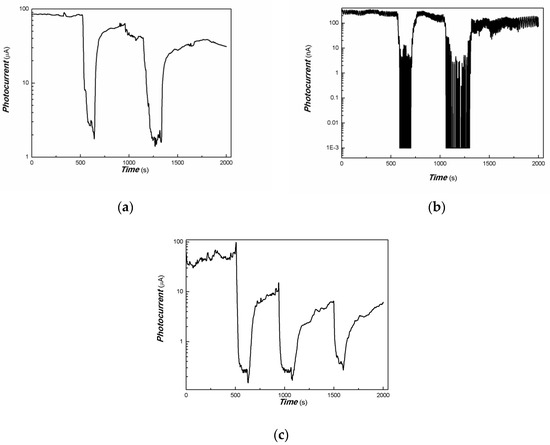 To examine the carriers’ photo-generated extracting ability with low-power light resource excitation, photocurrent responses were examined with a lower power of typical light resources and the representative nanocomposites. The results are shown in Figure 10 and Figure 11.