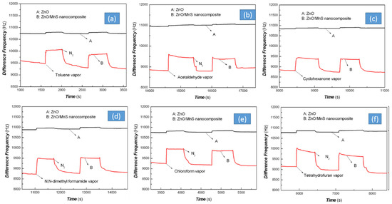 Frequency responses of ZnO/MnSx nanocomposite-based QCM arrays to VOCs ((a) toluene vapor; (b) acetaldehyde vapor; (c) cyclohexanone vapor; (d) N, N-dimethyl formamide vapor; (e) chloroform vapor; (f) tetrahydrofuran vapor).