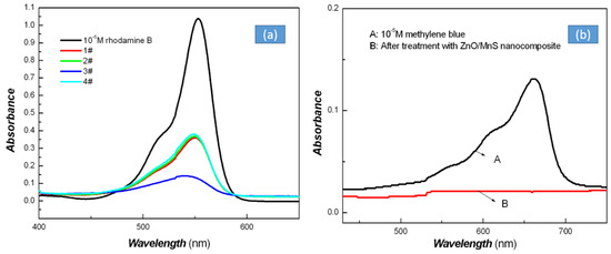 Degradation of ZnO/MnSx nanocomposite to organic pollutants ((a) rhodamine B; (b) methylene blue).