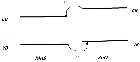 Combining the results of Figure 4, Figure 5, Figure 6, Figure 7, Figure 8, Figure 9, Figure 10, Figure 11, Figure 12 and Figure 13, it is shown that under the irradiation of weak visible light and the NIR, a large number of holes were collected at the interface between ZnO nanosheets and MnSx nanoparticles. The reaction between holes and H2O molecules adsorbed on the surface of ZnO would take place and result in the production of free radicals. These fresh free radicals are in favor of degrading some organic pollutants due to their strong oxidation ability. Otherwise, ZnO and MnS belong to wide bandgap semiconductors, the contact of ZnO nanosheets and MnSx nanoparticles formed a P/N junction. The presence of a P/N junction led to the formation of strong built-in electrical fields. Strong built-in electrical fields would sustainably produce holes generated by light inducement and promote the separation of carriers by light inducement. Additionally, the energy level position of ZnO and MnS is shown in Figure 17.