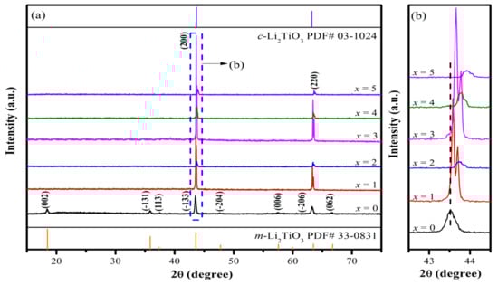 The X-ray diffraction (XRD) patterns of LTCN + x wt% LiF (x = 0–5) ceramics sintered at 950 °C for 3 h are shown in Figure 1a. Meanwhile, the XRD pattern of the pure LTCN ceramic is presented in Figure 1 as comparison. It is obvious from Figure 1a that the transition from an ordered monoclinic phase to a disordered cubic phase occurs after LiF doping. That is, all LTCN + x wt% LiF ceramics present pure cubic Li2TiO3 phases (PDF # 03-1024). As shown in Figure 1b, the (200) peak shifts to a higher 2θ direction with increasing LiF content. This phenomenon should be attributed to the variation in lattice parameters according to the Bragg equation (Equation (2)):