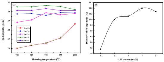 (a) bulk density of LTCN ceramics with different LiF contents sintered at 900–1000 °C for 3 h, (b) diameter shrinkage of LTCN + x wt% LiF ceramics sintered at 950 °C.