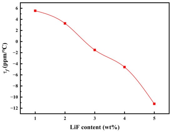 Figure 6 shows the variation in the τf value of LTCN + x wt% LiF ceramics sintered at 950 °C for 3 h. It is clearly seen that the τf value gradually decreases with the increase in LiF doping amount, mainly due to the moderating effect of LiF with a negative τf value (−135 ppm/°C) on LTCN with a positive τf value (+9.27 ppm/°C) [45,46]. In this study, the near-zero τf values are achieved at 2 ≤ x ≤ 4, although the LiF doping amount has a significant effect on the Q × f values (Figure 5b). Therefore, the balance between the τf value and the Q × f value is important for practical applications of microwave dielectric ceramics. In summary, the LTCN + 3 wt% LiF ceramic sintered at 950 °C for 3 h exhibits good microwave dielectric properties of εr = 19.01, Q × f = 144,890 GHz and τf = −1.52 ppm/°C.